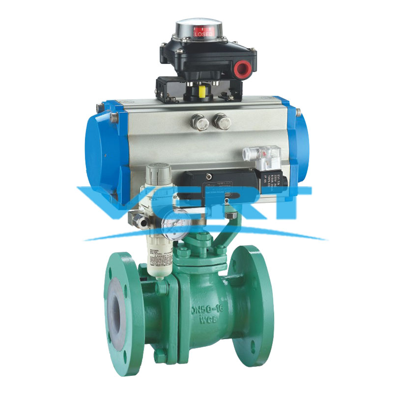 The pneumatic fluorine lining O-type cut-off ball valve is a kind of high-grade ball valve with 360 degree right angle rotary.The inner wall of the valve body and the components in the valve body in contact with the fluid adopt the high-temperature molding fluorine lined plastic process, and is coated with a layer of anti-corrosion materials such as per fluoro ethylene(F 46) , polytetrafluoroethylene(PTFE) , soluble polytetrafluoroethylene(PFA) , etc., which can completely cutoff the contact between the corrosive medium and the valve bodyshell.It has the advantages of good sealing performance, sensitive action, linear flow passage and large flow capacity.It can be used with two position fve-way solenoid valve and control box to realize switch control.It is widely used in the control of acid, alkali and other corrosive media, poisonous, volatile and permeable gas and liquid media.